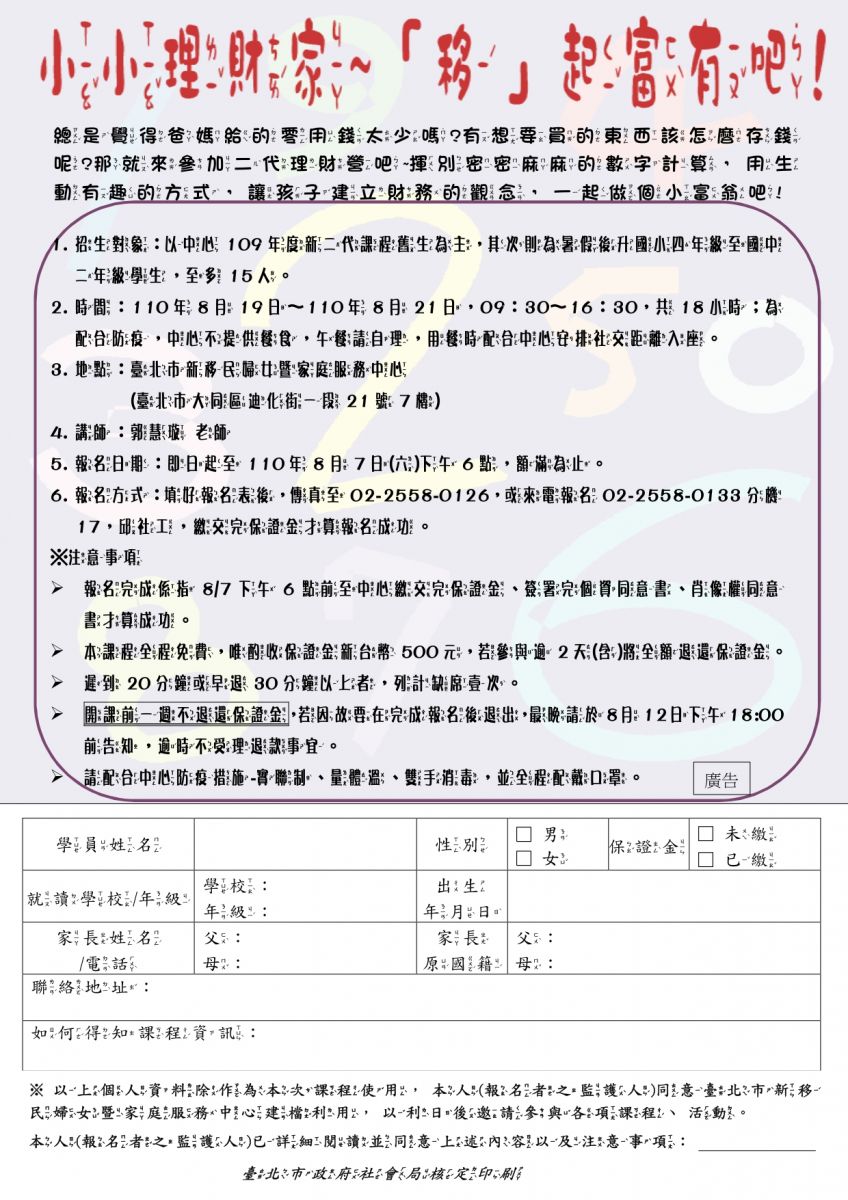 趕快來參加今年的新二代理財課程吧!內容諮詢詳見DM,歡迎來電諮詢。