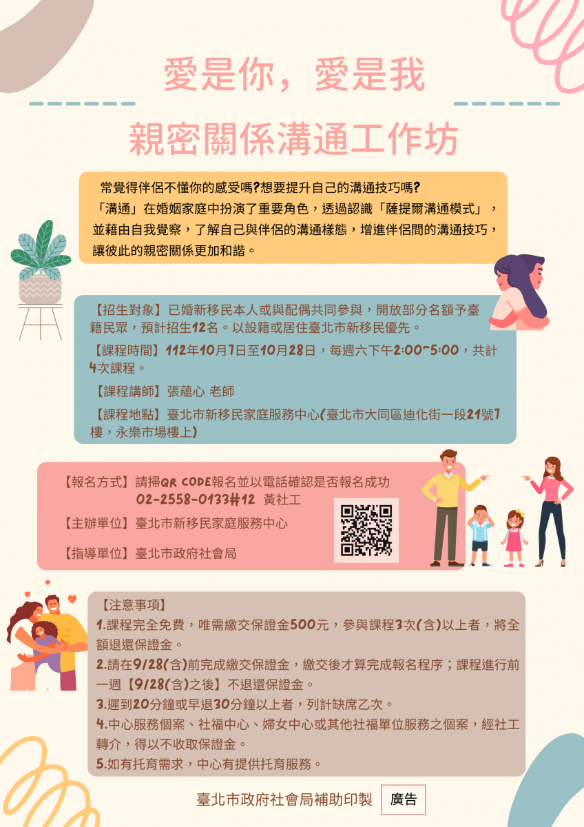 *課程地點:臺北市新移民家庭服務中心(臺北市大同區迪化街一段21號7樓,永樂市場樓上)。