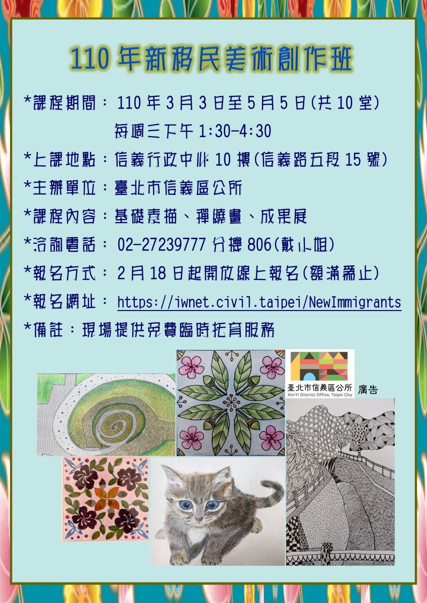 臺北市信義區公所將於110年3月3日至5月5日每週三下午1時30分至4時30分,於信義區行政中心10樓(信義路5段15號10樓)辦理「新移民美術創作班」,課程免費但得視老師上課所需自付部分材料費,現場提供臨時托育服務,並自2月18日起開放線上報名,額滿為止,報名網址-