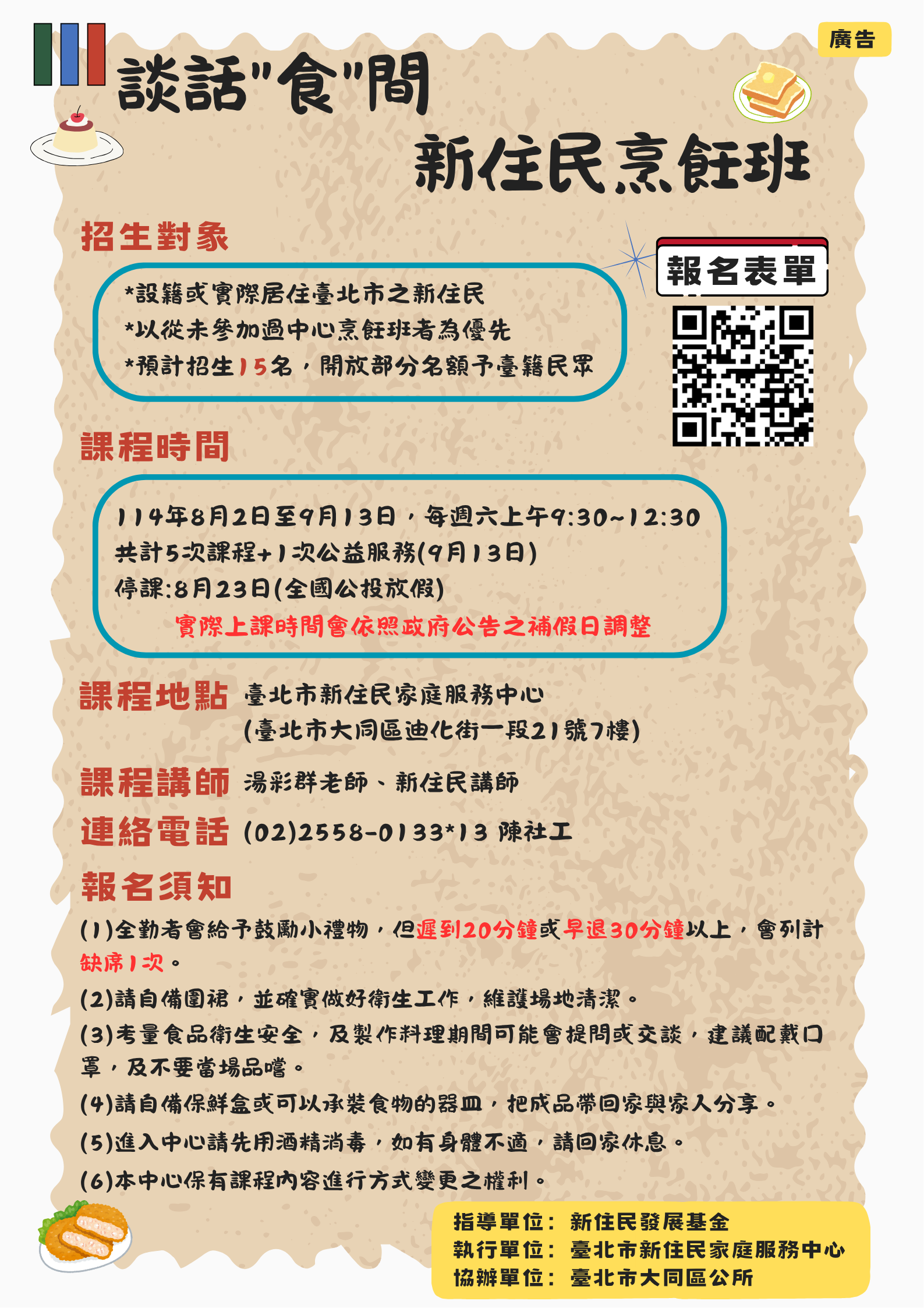 今年烹飪班分成兩梯次上課,第一梯次烹飪班報名活動開跑囉~除了料理學習外,還有意想不到的收穫喔!!!!請盡速手刀報名~詳細報名資訊請詳閱DM或來電諮詢!