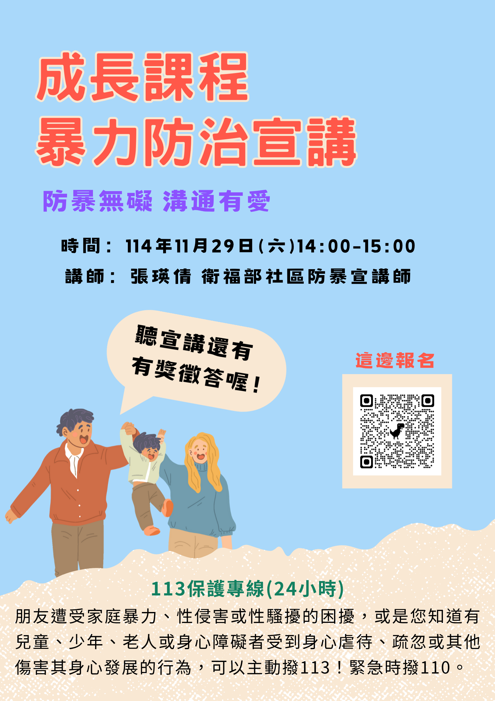 本中心與家防中心、城男舊事心驛站聯手,將辦理「成長課程-暴力防治宣講」,讓大家一起學習如何識別暴力徵兆、掌握自我保護技巧,並提升危機應對能力!👮♀️