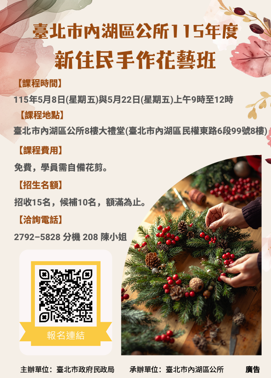 臺北市內湖區公所將於115年5月8日(星期五)及5月22日(星期五)上午9時至12時,於公所8樓大禮堂(臺北市內湖區民權東路6段99號8 樓),開辦『115年度新住民手作花藝班』,歡迎新住民朋友踴躍報名參加,詳情請上內湖區公所網站