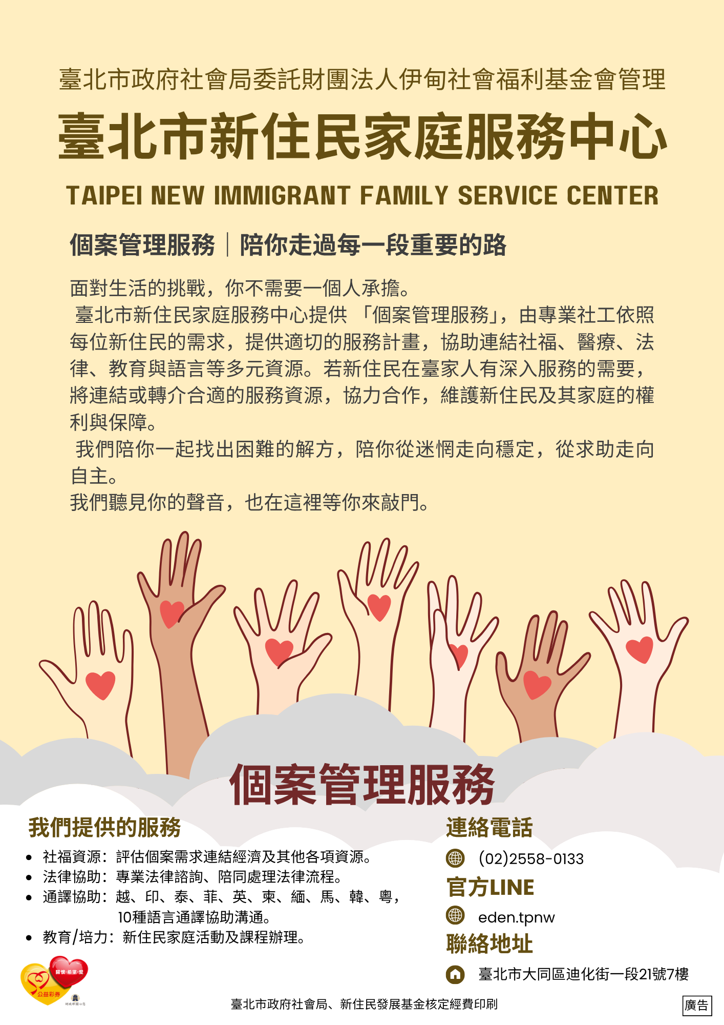 臺北市新住民家庭服務中心提供個案管理服務,由專業社工根據每位新住民的需求,協助連結社福、醫療、法律、教育與語言等多元資源,陪你找出適合的支持方案。