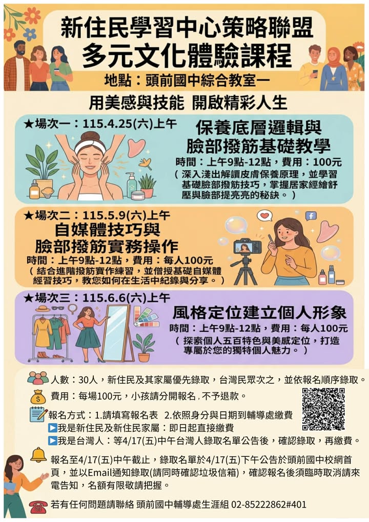 ▶️我是新住民及新住民家屬:填寫完報名表後,即日起直接頭前國中輔導處生涯組完成繳費,才算報名成功。