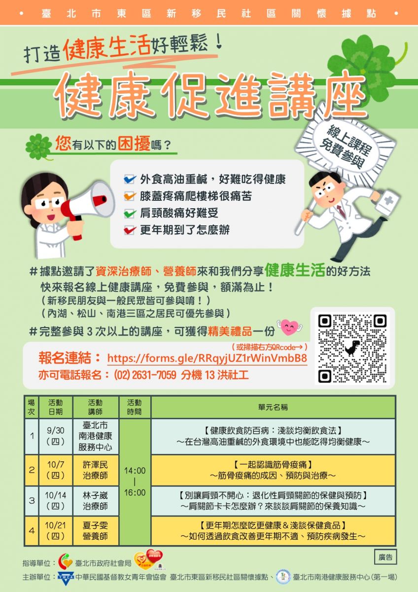 【轉知】東區新移民據點-打造健康生活好輕鬆!健康促進講座