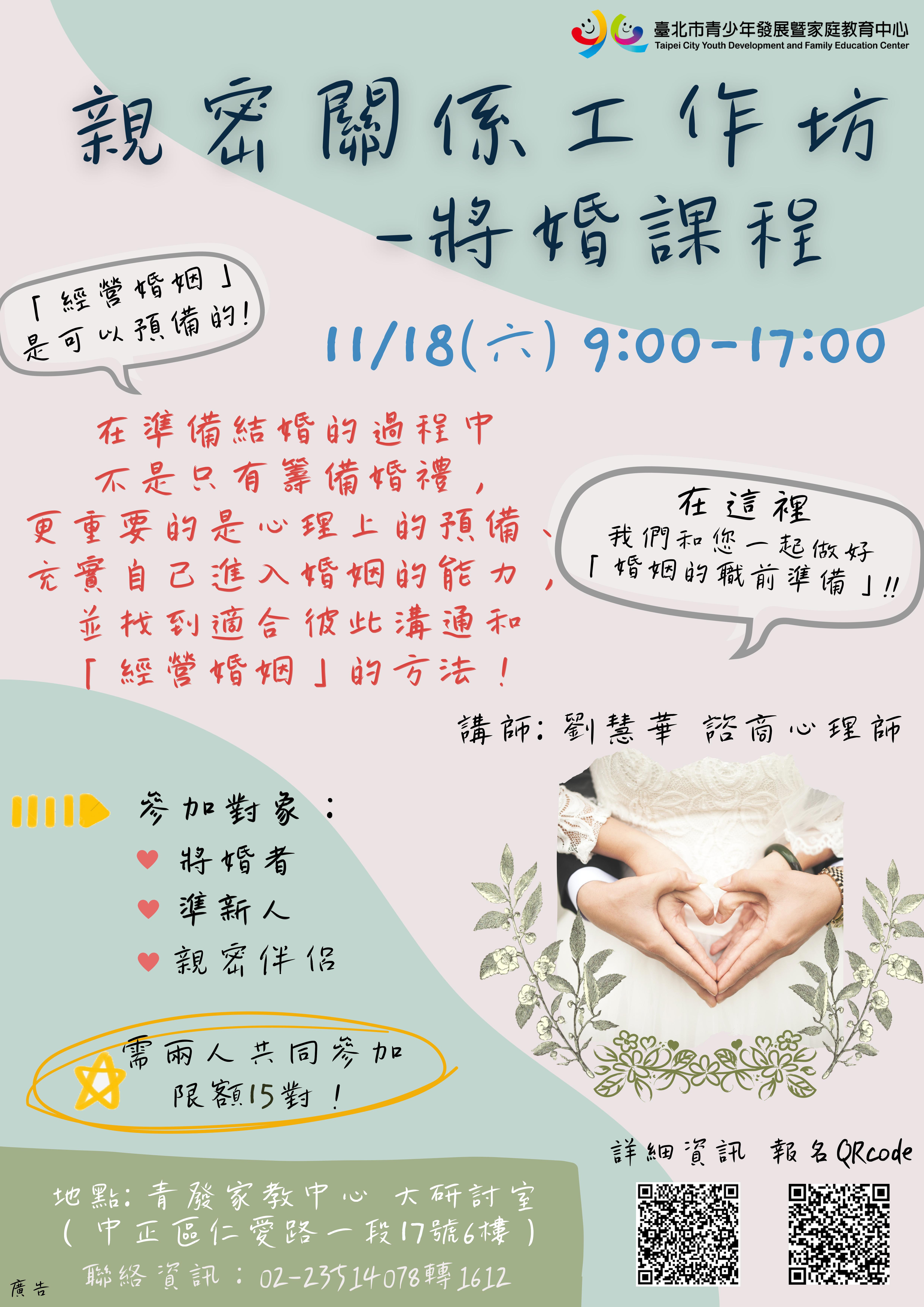 【轉知】臺北市青少年發展暨家庭教育中心-親密關係工作坊~將婚課程