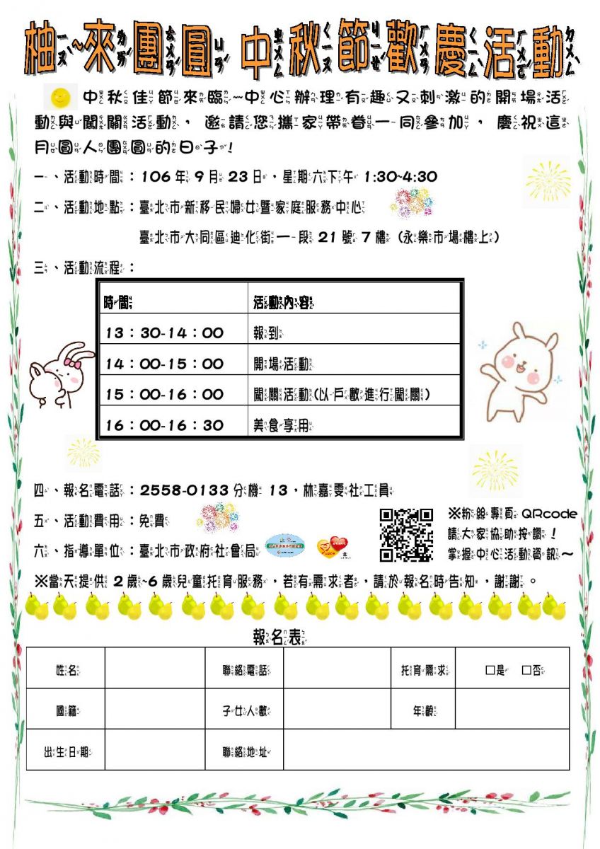 中心辦理有趣又刺激的開場活動與闖關活動,邀請您攜家帶眷一同參加,慶祝這月圓人團圓的日子!