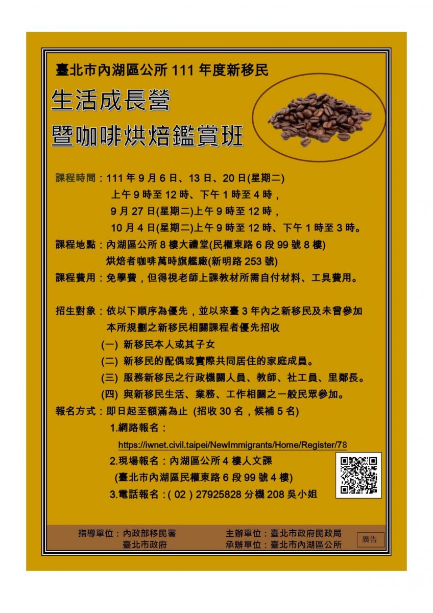【轉知】臺北市內湖區公所-新移民生活成長營暨咖啡烘焙鑑賞班