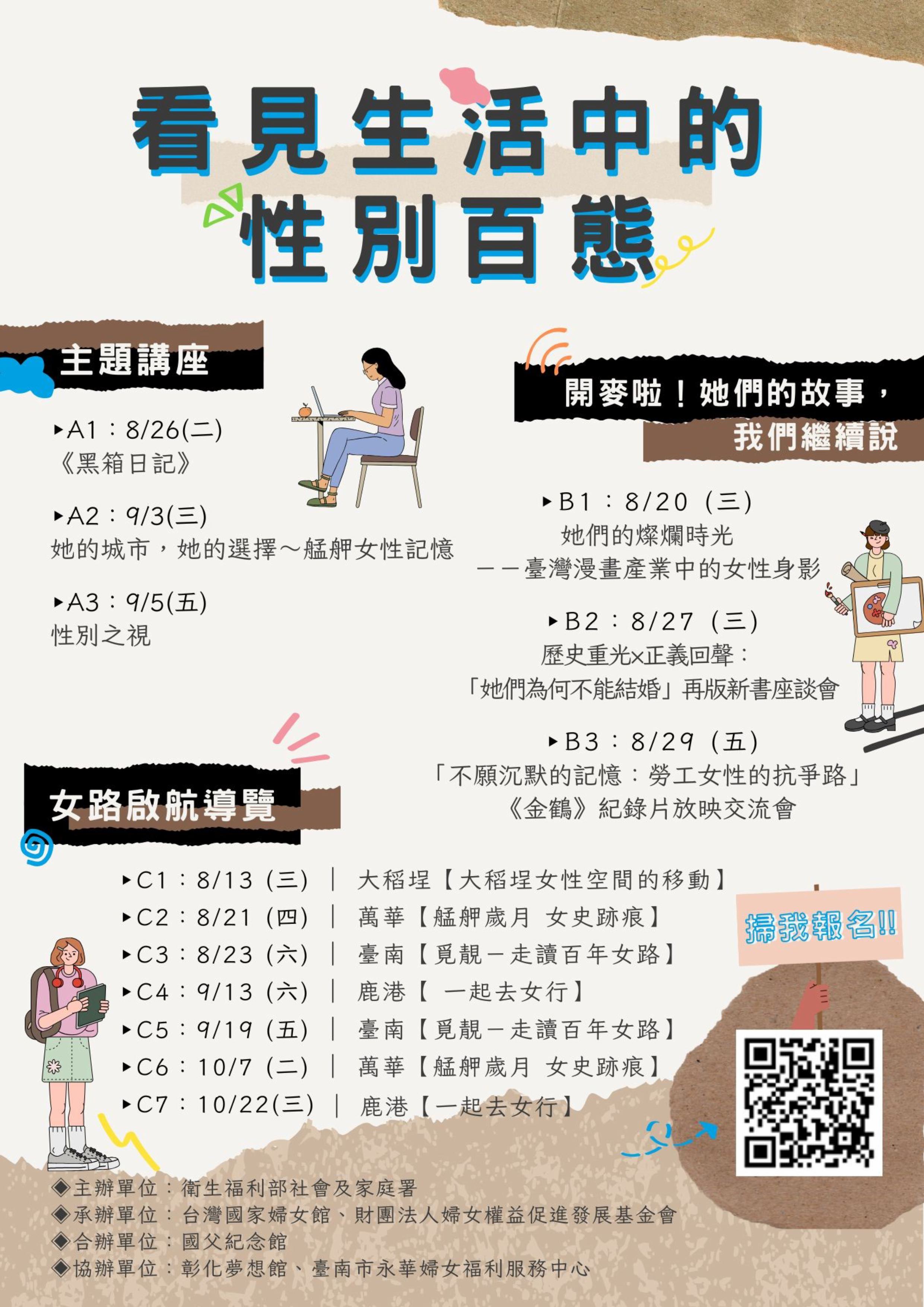 本年度台灣國家婦女館將透過主題講座、性別平權漫畫系列活動及女路啟航導覽等方式辦理,於114年8月至10月間與國立國父紀念館、彰化夢想館及臺南市永華婦女福利服務中心等單位合作,在北部、中部及南部均有辦理