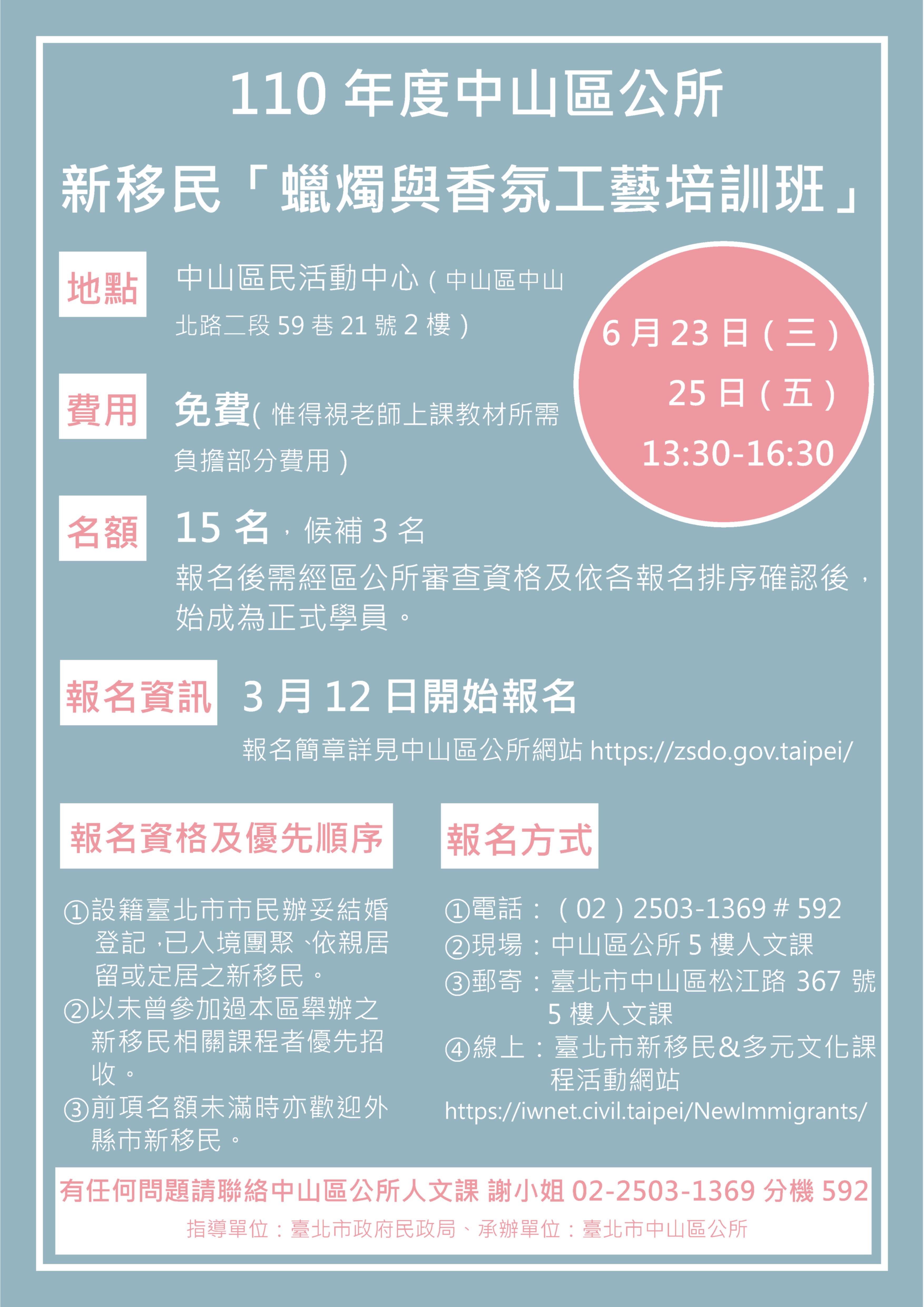 【轉知】 中山區公所110年新移民蠟燭工藝與香氛療癒生活班及蠟燭與香氛工藝培訓班