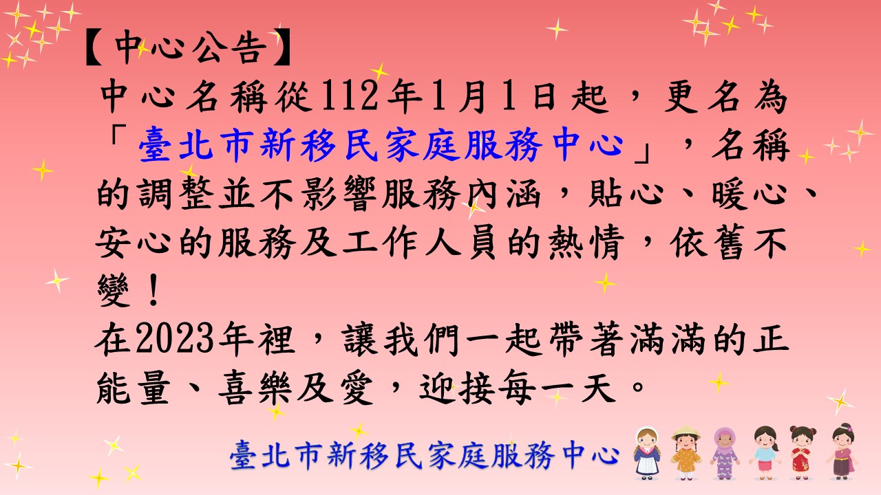 【中心公告】中心更名為「臺北市新移民家庭服務中心」