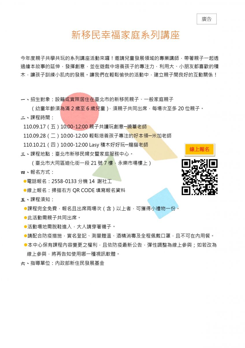 【中心活動宣廣】新移民幸福家庭系列講座