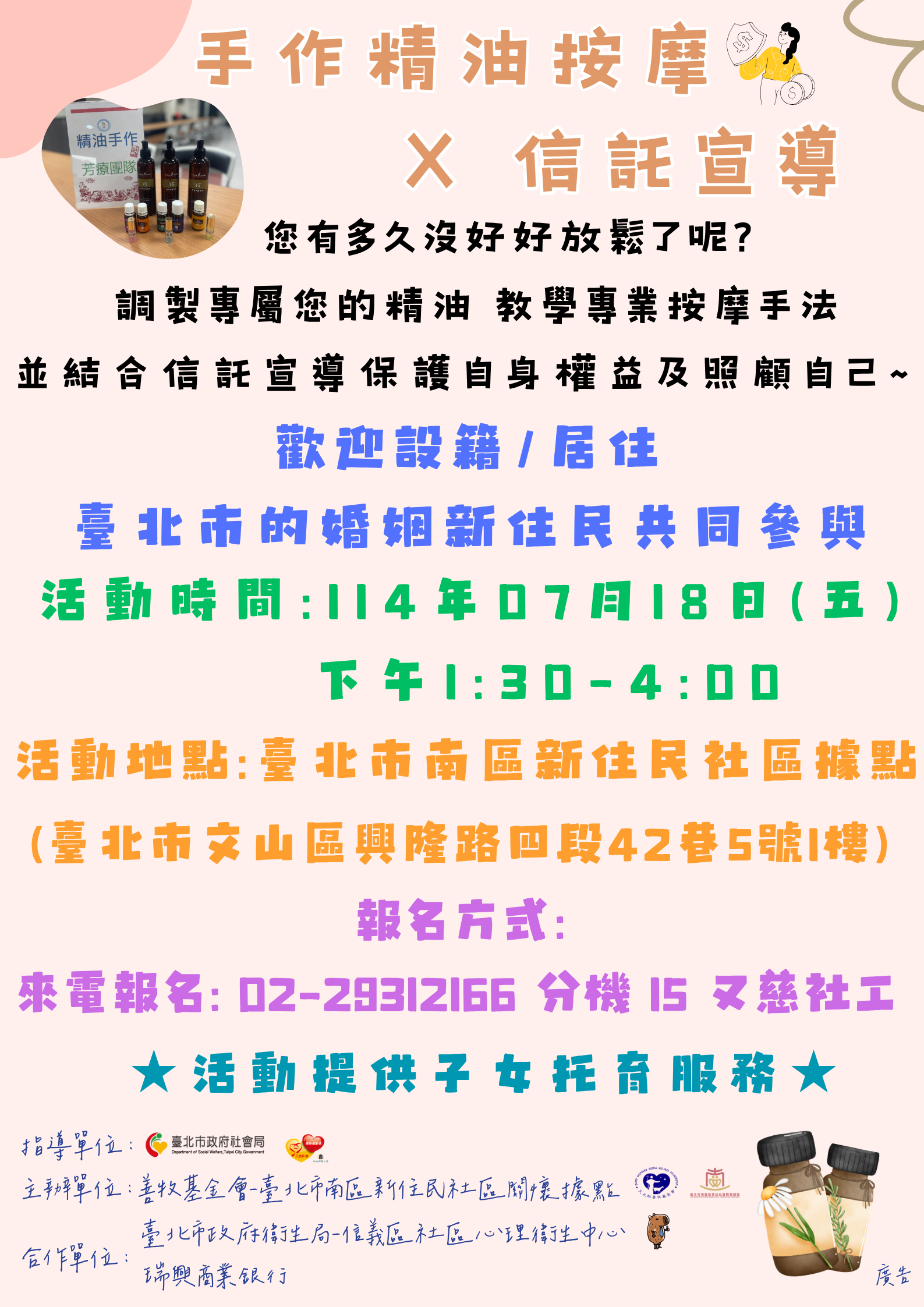 【轉知】臺北市南區新住民社區關懷據點-手作精油按摩X信託宣導