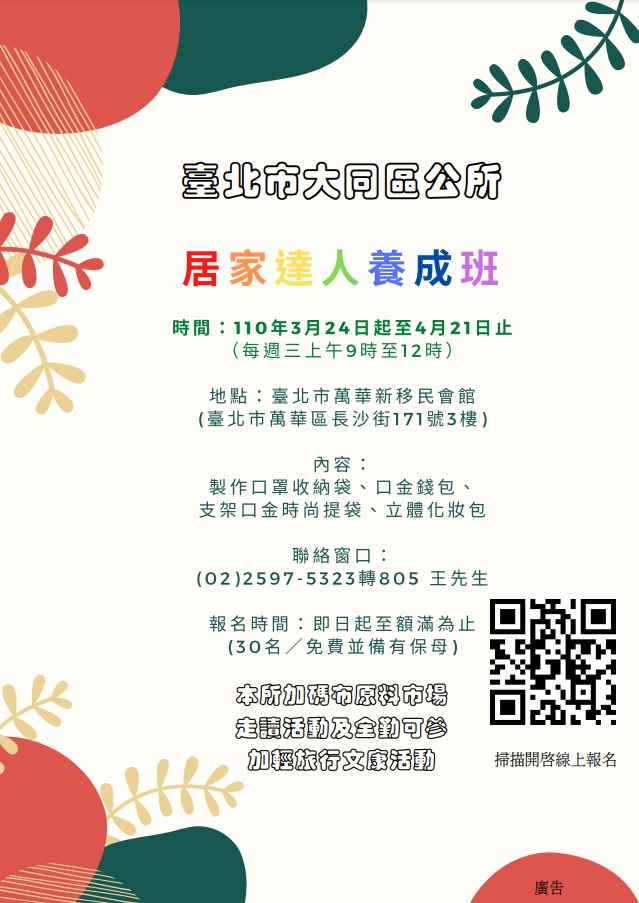 臺北市大同區公所將於萬華新移民會館開辦『110年度居家達人養成班』,上課時間為110年3月24日至4月21日,每週三上午9時至12時及下午1時至4時,歡迎新移民朋友踴躍參加,詳情請至大同區網站查詢或洽02-2597-5323分機805王先生