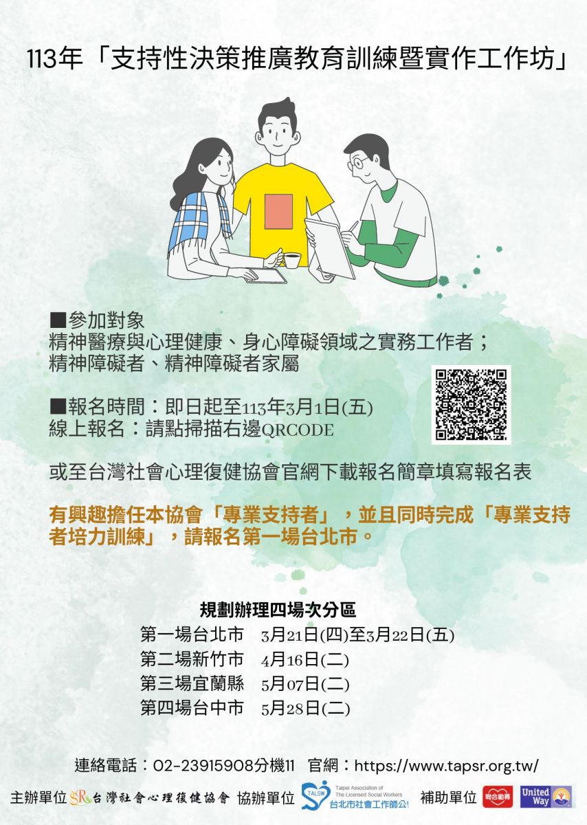 【轉知】台灣社會心理復健協會 / 精神障礙者社會融合與自立生活中心-支持性決策推廣教育訓練暨實作工作坊