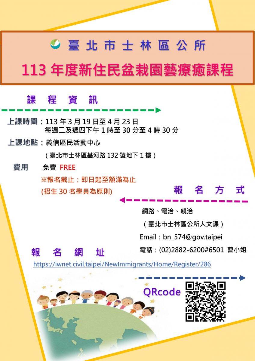 【轉知】臺北市士林區公所-新住民盆栽園藝療癒課程