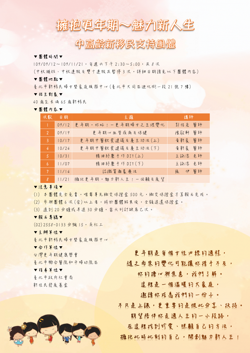 中心於9/12至11/21每週六(逢國定假日及補班日暫停)將舉辦【擁抱更年期,魅力新人生~中高齡新移民支持團體】,將邀請醫師來讓大家認識更年期,以及學習自我保健及紓壓的方式哦!歡迎邀請有需要的新移民踴躍報名參加,名額有限,額滿為止~