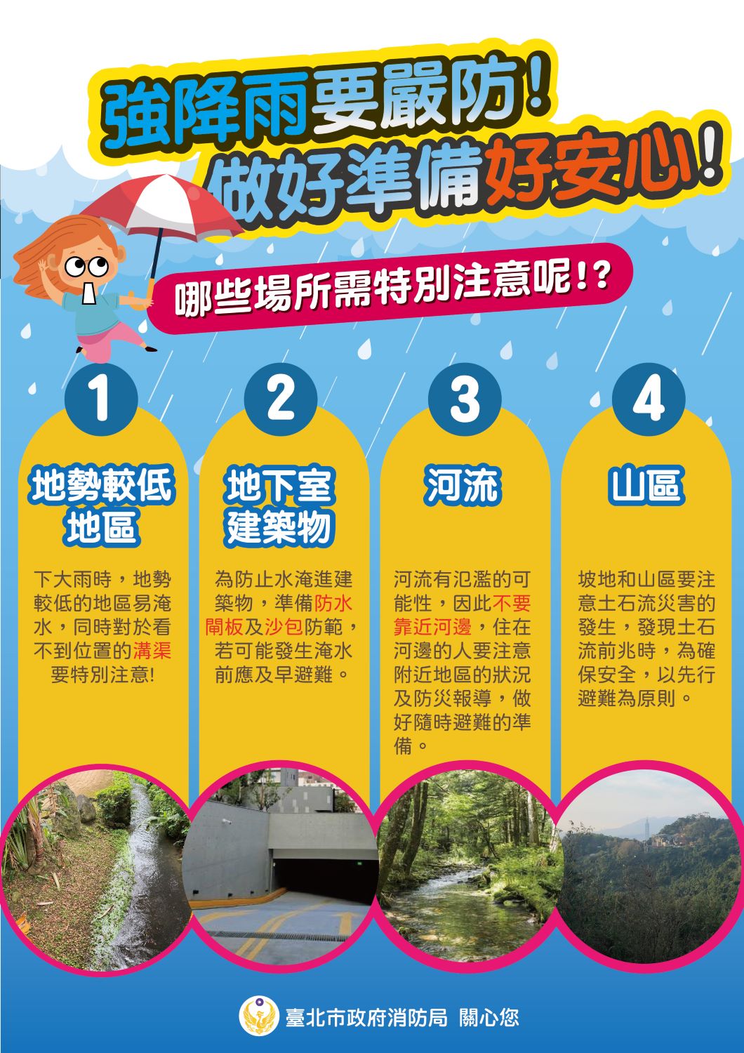 汛期即將來臨,請民眾提前做好清淤排水,注意氣象與災害資訊,警覺。若前往山區或河邊等地區,應隨時注意環境變化,如發現任何異 常,應馬上撤離,以維生命安全。