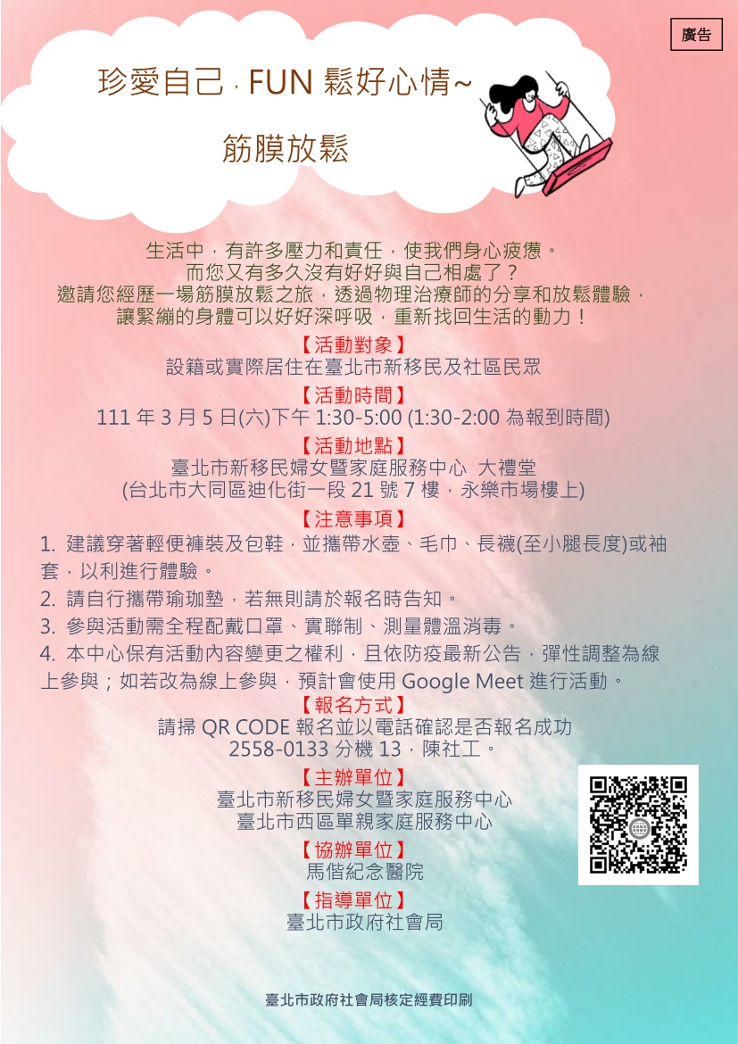 *若有意願報名參加,請掃QR CODE進入報名連結,並以電話確認是否報名成功,電話為:02-2558-0133#13陳社工。