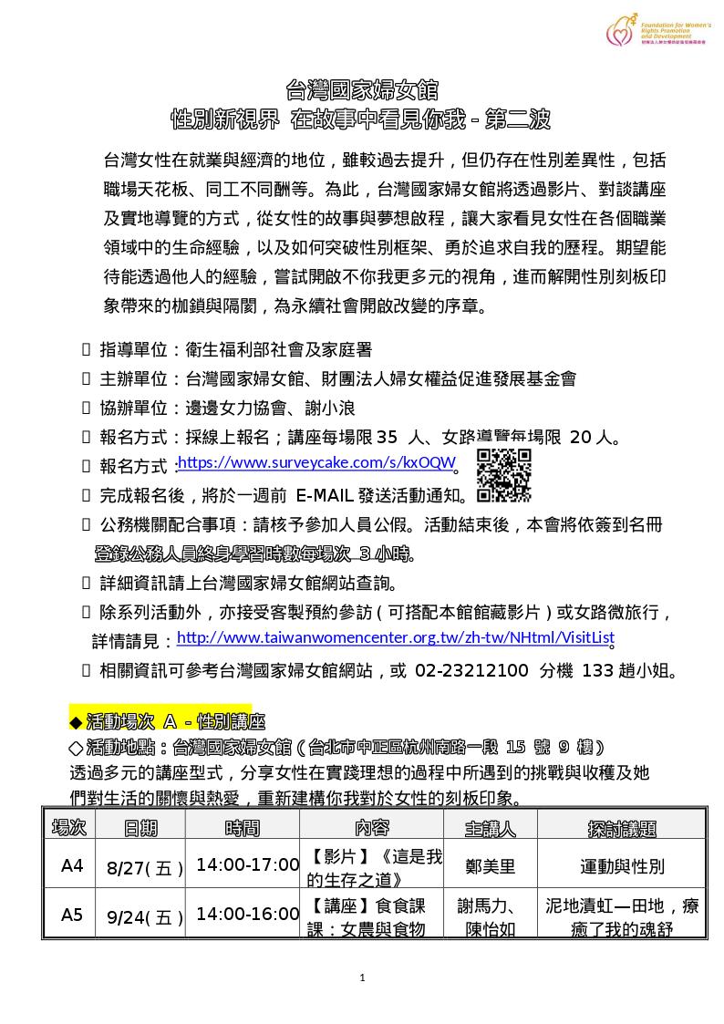 【轉知】台灣國家婦女館辦理110年8月至11月性別平等教育宣導系列活動
