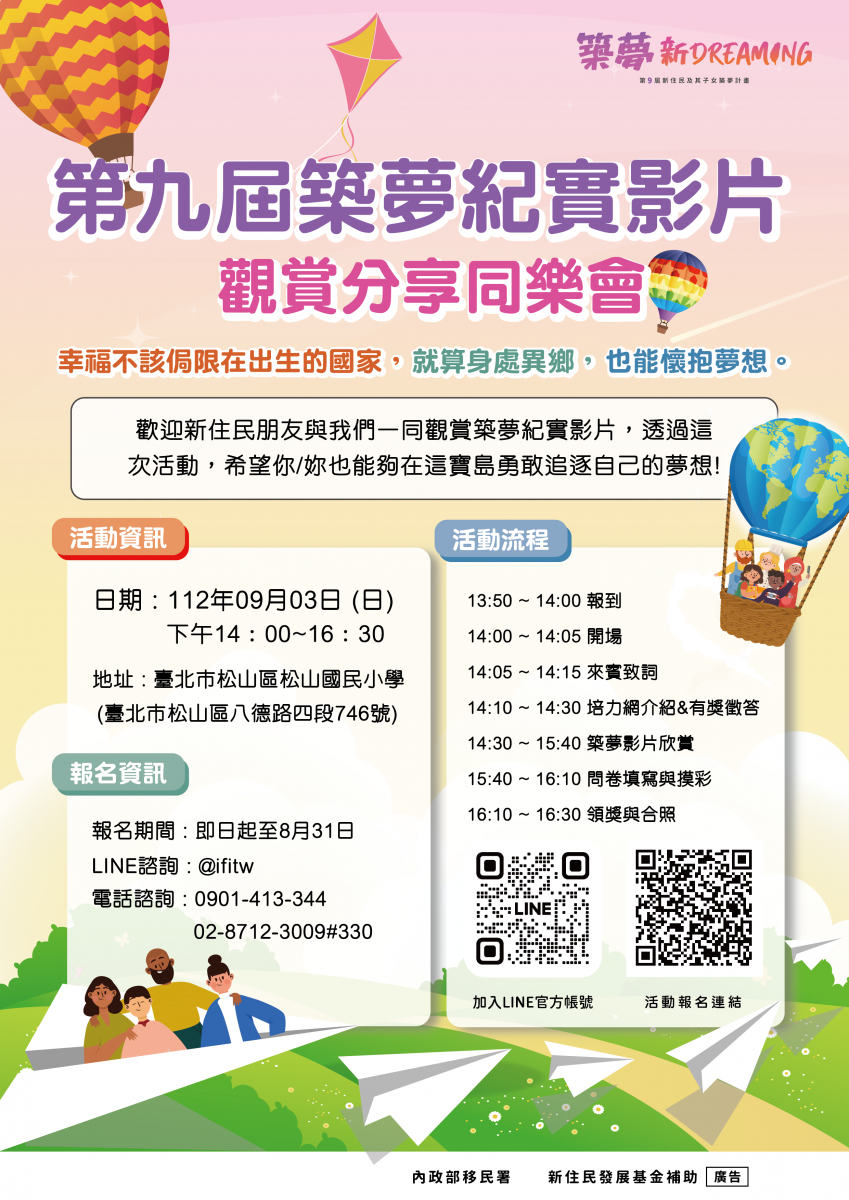 【轉知】內政部移民署-第九屆築夢紀實影片觀賞分享同樂會邀請