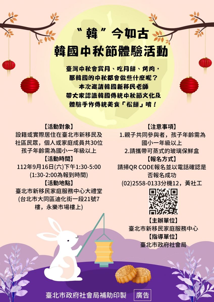 *活動對象:設籍或實際居住在臺北市新移民及社區民眾,個人或家庭成員共30位孩子年齡需為國小一年級以上