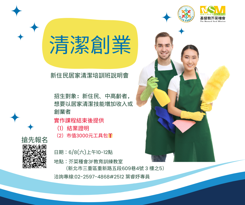 【轉知】財團法人基督教芥菜種會-新住民居家清潔技能培訓說明會暨面試