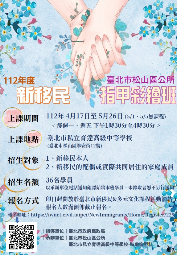 臺北市松山區公所訂於112年4月17日至5月26日,每週一、五下午1時30分至4時30分,開辦「112年度新移民指甲彩繪班」,上課地點為臺北市私立育達高級中等學校,歡迎新移民朋友踴躍參加,本次僅開放網路報名方式!