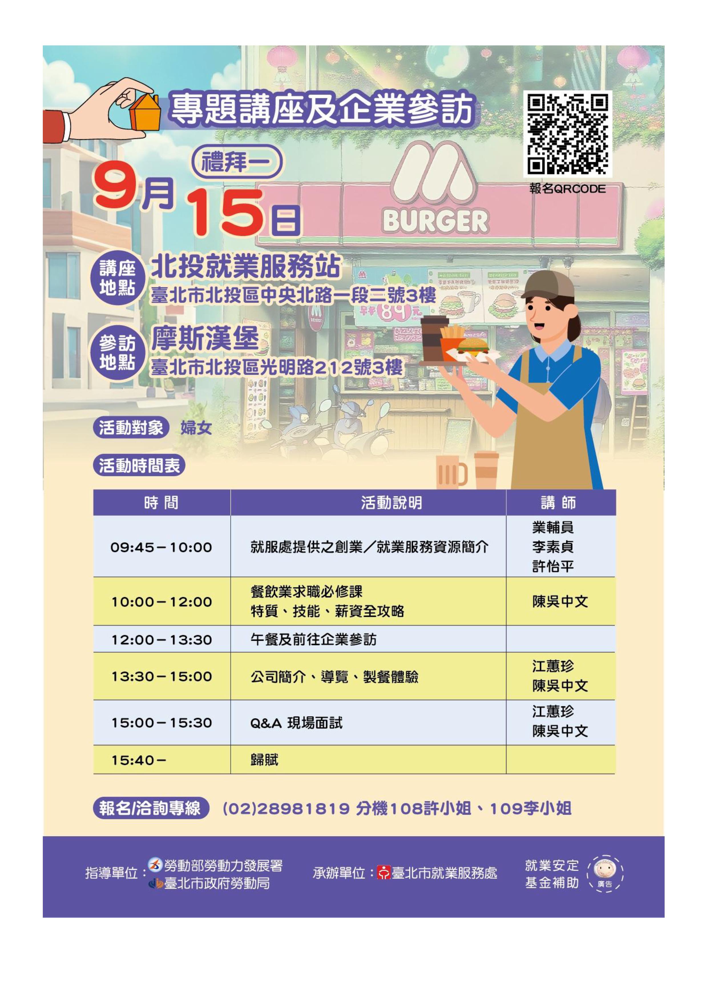 本次企業參訪至「摩斯漢堡」,上半場講座將由企業代表分享餐飲業從業所需的特質,並讓學員了解目前餐飲產業的現況、必備技能、工作態度、薪資待遇及相關案例。下半場將安排學員前往實際工作場域,了解工作內容並親身體驗,對企業有興趣者還可現場安排一對一面試,協助學員快速加入餐飲業的行列。。
