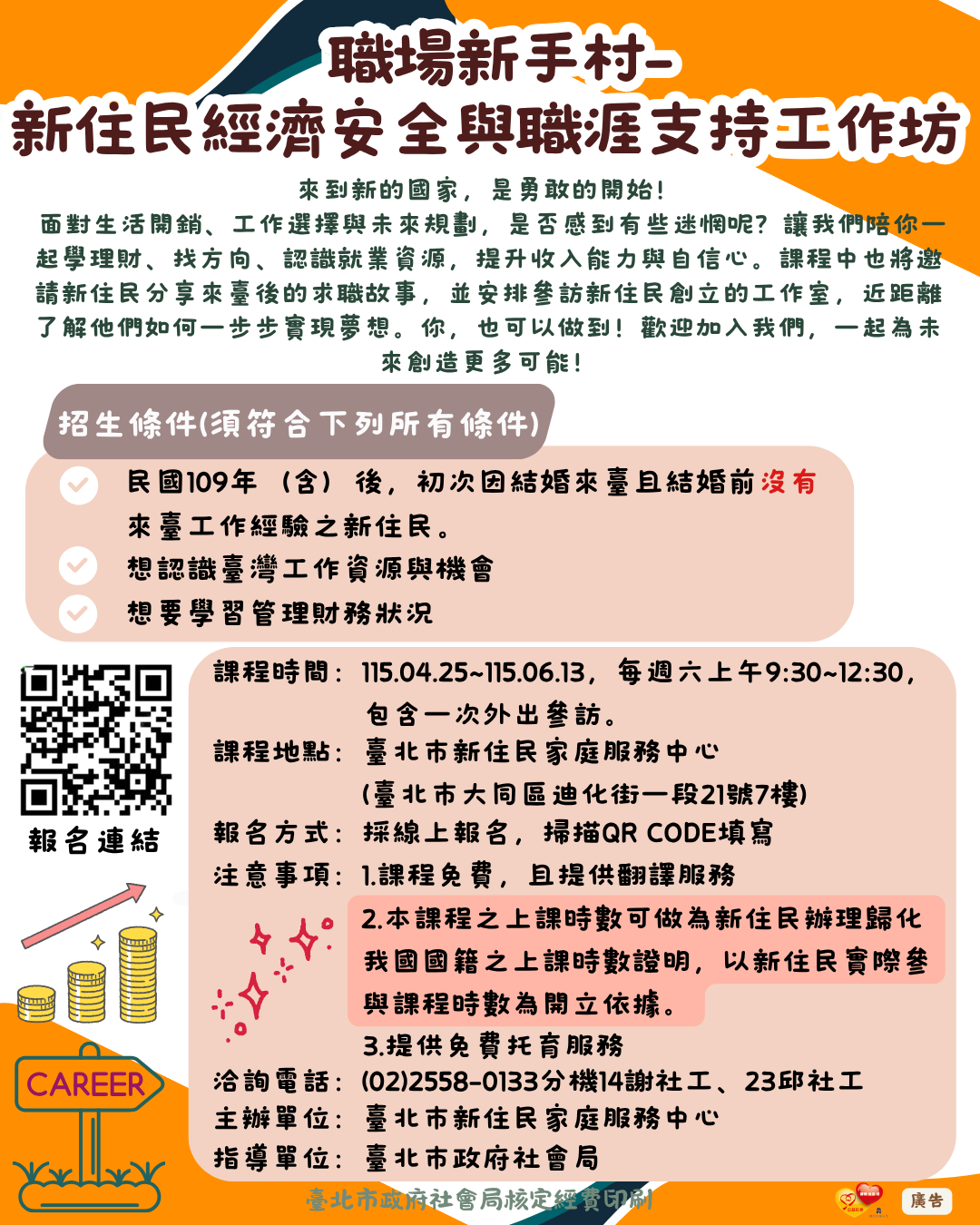 【中心活動宣廣】職場新手村-新住民經濟安全與職涯支持工作坊