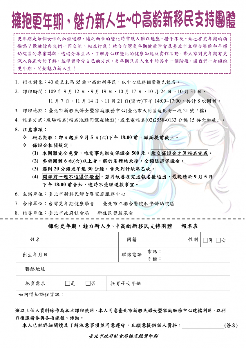 中心於9/12至11/21每週六(逢國定假日及補班日暫停)將舉辦【擁抱更年期,魅力新人生~中高齡新移民支持團體】,將邀請醫師來讓大家認識更年期,以及學習自我保健及紓壓的方式哦!歡迎邀請有需要的新移民踴躍報名參加,名額有限,額滿為止~