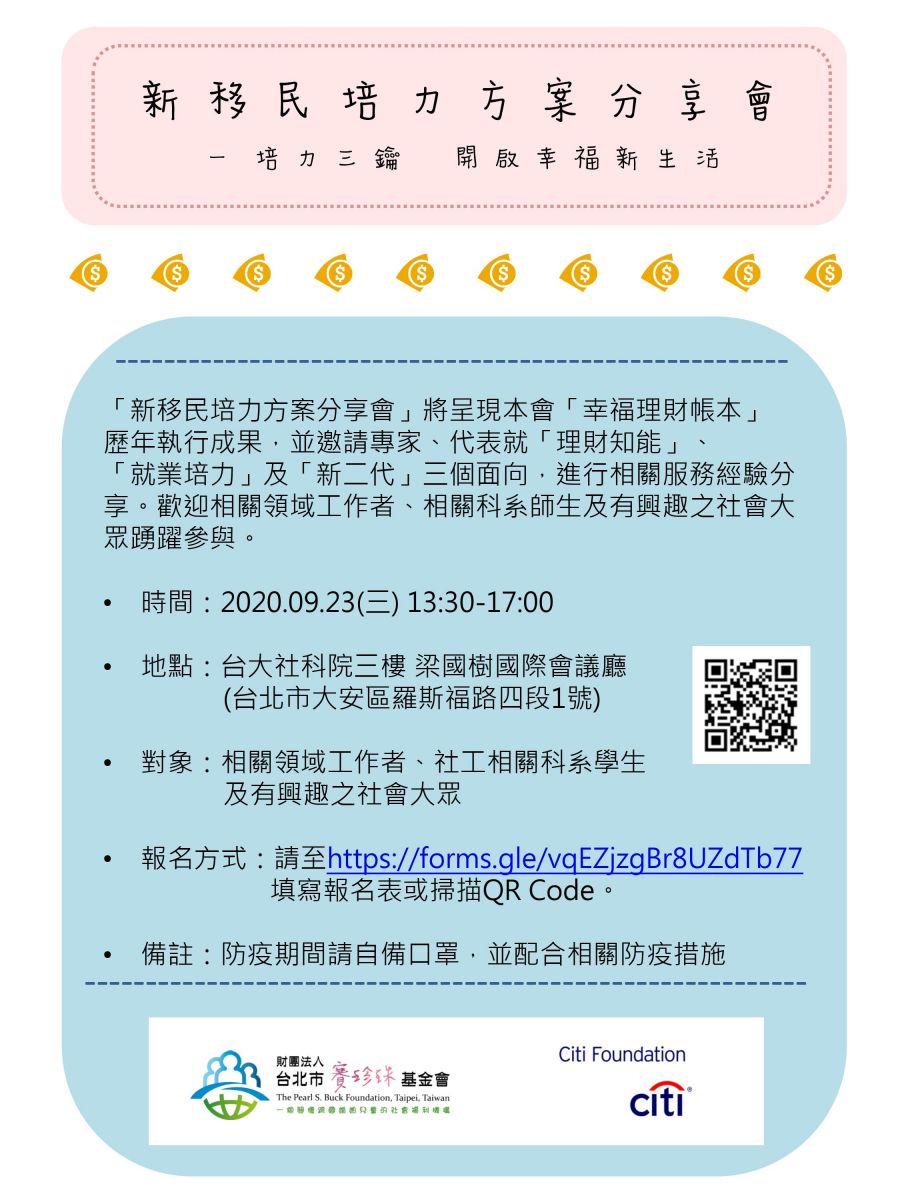 賽珍珠基金會將於109年9月23日(三)13:30-17:00辦理「新移民培力方案分享會」,發表本會幸福理財帳本歷年執行成果,也邀請相關領域的專家、代表分享在「理財知能」、「就業培力」、「新二代」三個面向的服務經驗。