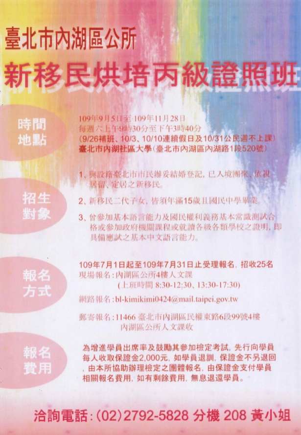 【轉知】 內湖區公所「新移民烘焙丙級證照班」
