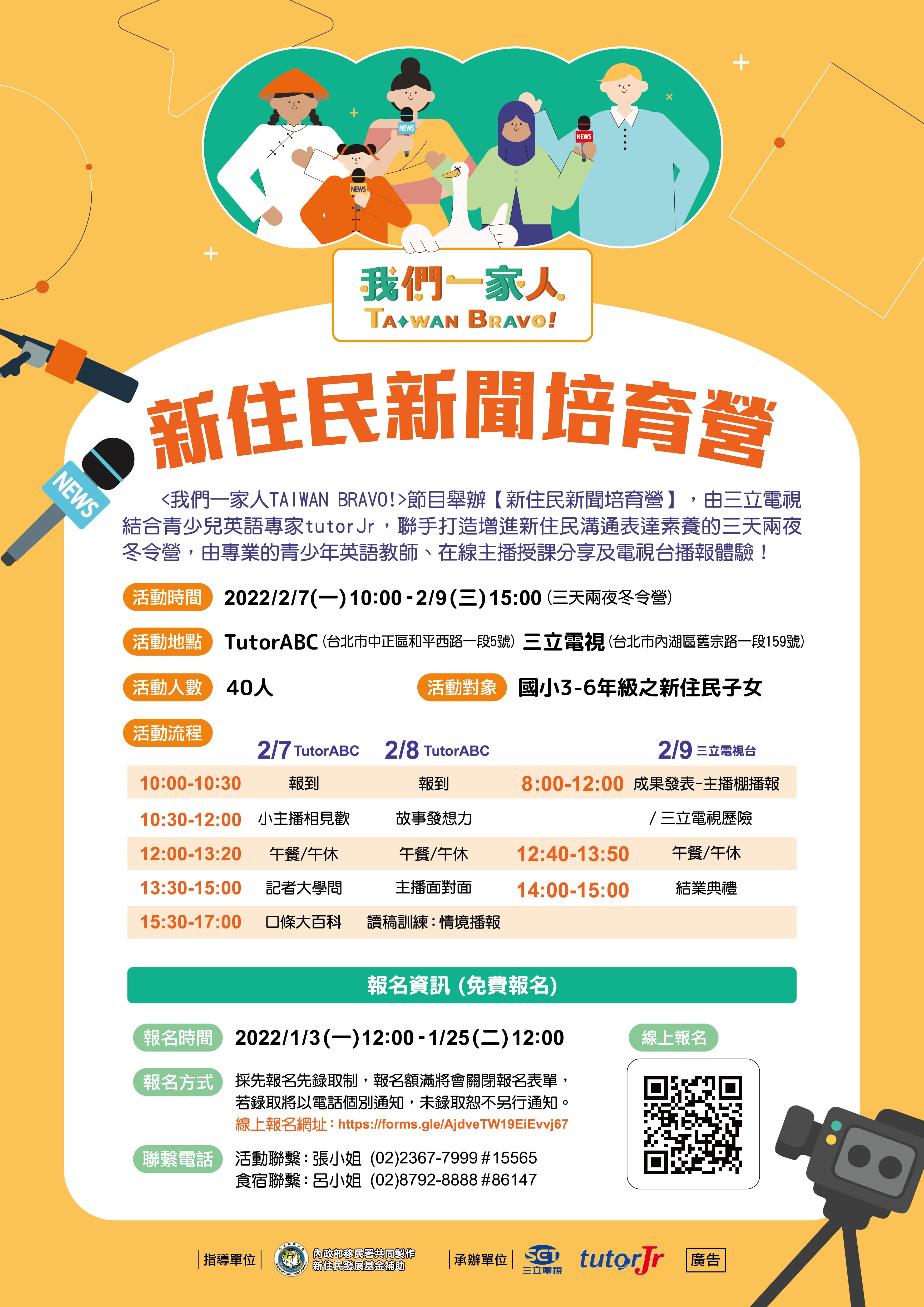 由內政部移民署與三立電視共同製播《我們一家人Taiwan Bravo!》節目所舉辦的「新住民新聞培育營」活動報名開始囉! 三立電視結合青少兒英語專家tutor Jr,聯手打造增進新住民溝通表達素養的三天兩夜冬令營,由專業的青少年英語教師、在線主播授課分享及電視台播報體驗!活動時間為111年2月7日至111年2月9日(三天兩夜冬令營),受理報名自111年1月3日至1月25日截止,活動對象以國小3-6年級之新住民子女為主,請於報名期限內,完成線上報名程序,報名方式採先報名先錄取制,名額有限,歡迎有興趣的新住民小朋友趕快來報名!