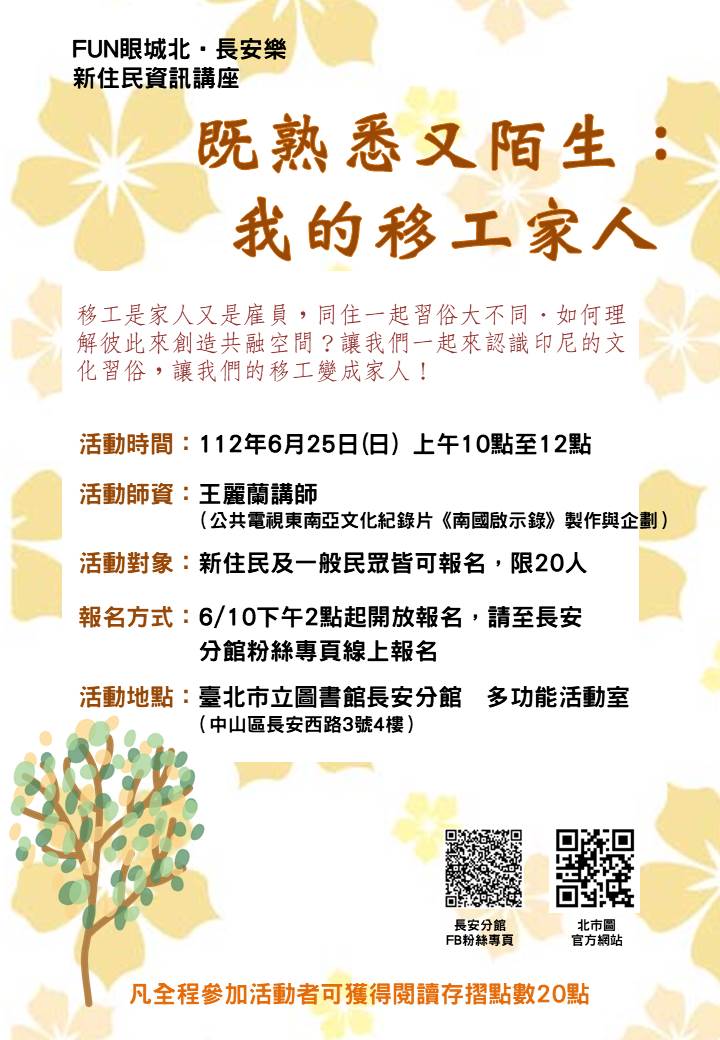 【轉知】臺北市立圖書館長安分館-新住民資訊講座「既熟悉又陌生:我的移工家人」
