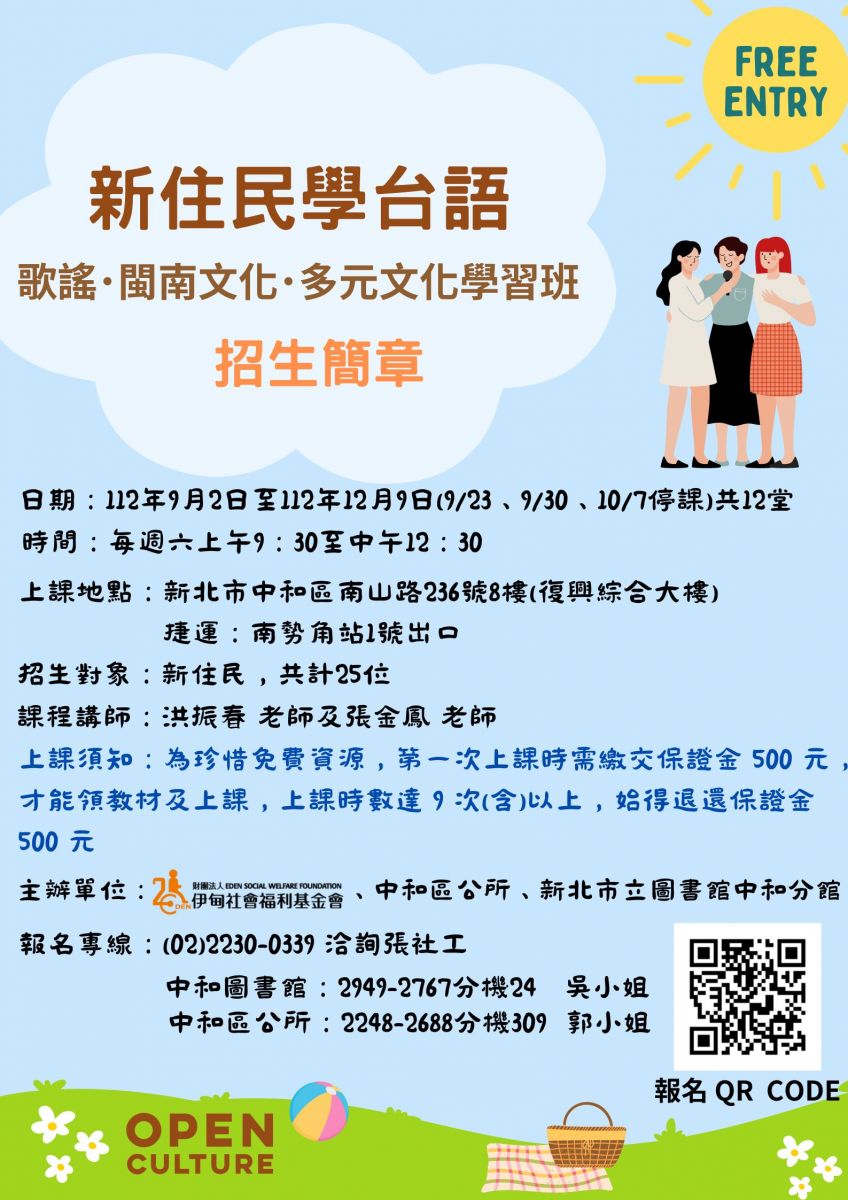 【轉知】伊甸基金會新移民家庭成長中心-112年新住民學台語班開始報名囉~