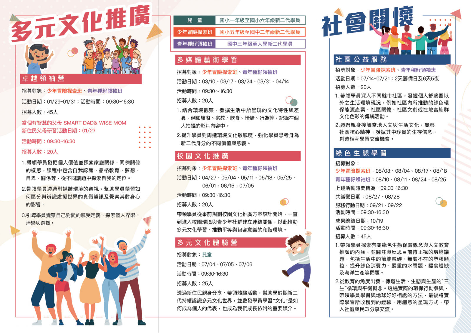 一、本會多年來投入新住民二代子女的培力工作,透過多樣化的課程培養其專業能力,今年將延續辦理新二代多元智慧培力課程,希望透過專業師資訓練培養新住民二代子女學習八大優勢能力,增加其未來的競爭力;由於新二代多元智慧培力課程內容多元豐富,以致時間及地點眾多,課程資訊詳如附件簡章。
