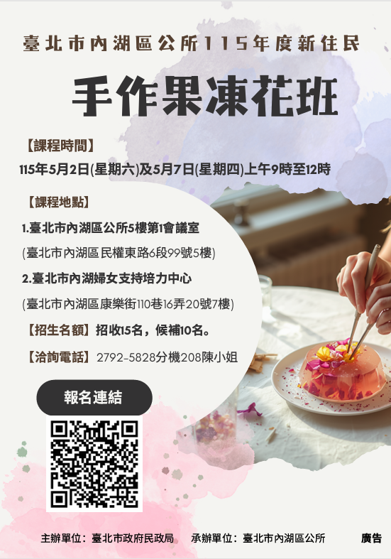 臺北市內湖區公所將於115年5 月2日(星期六)及5月7日(星期四)上午9時至12時,於公所5樓第1會議室(臺北市內湖區民權東路6段 99號5樓),開辦「115年度新住民手作果凍花班」,歡迎新住民朋友踴躍報名參加,詳情請上內湖區公所網站