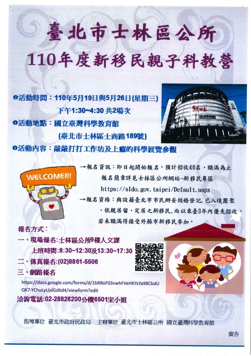 【轉知】臺北市士林區公所-110年度新移民親子科教營