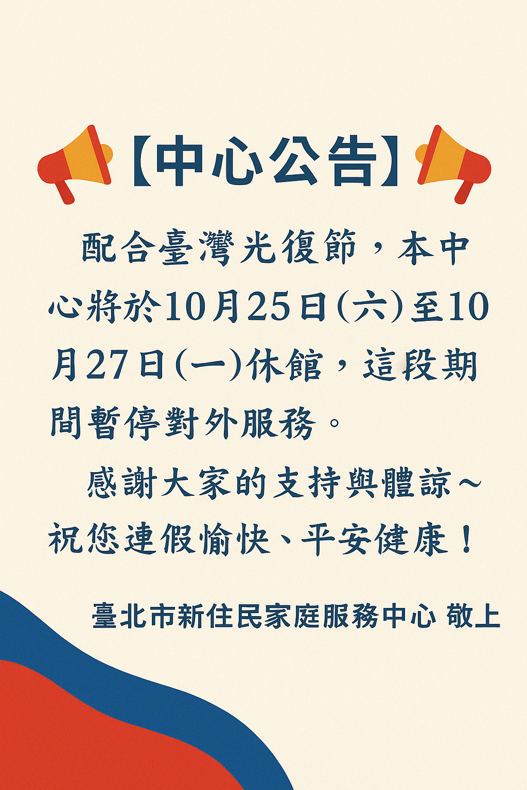📢【中心公告】📢臺灣光復節休館