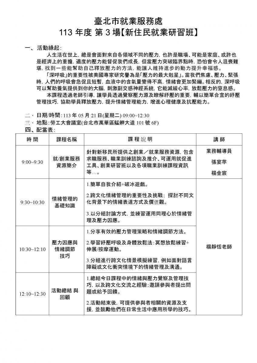 【轉知】臺北市就業服務處-新住民就業研習班】解壓療癒呼吸法