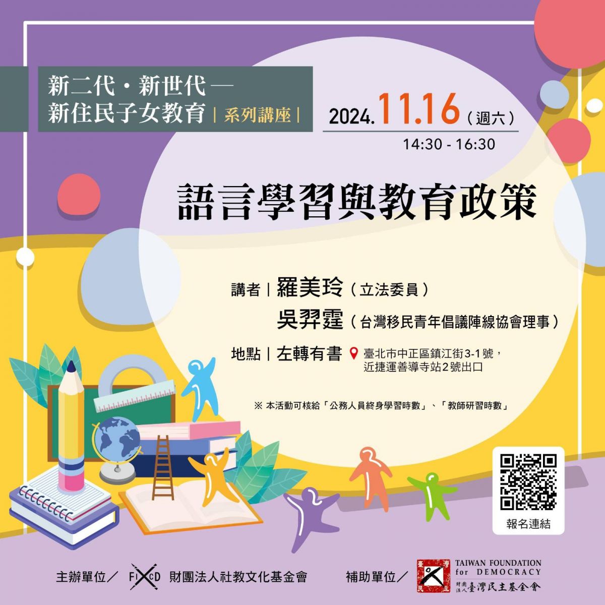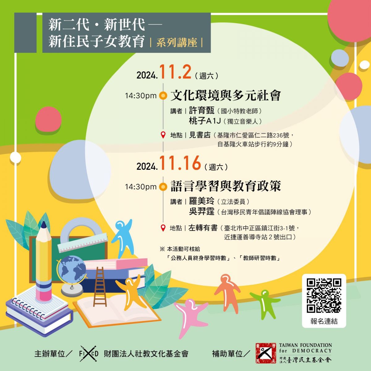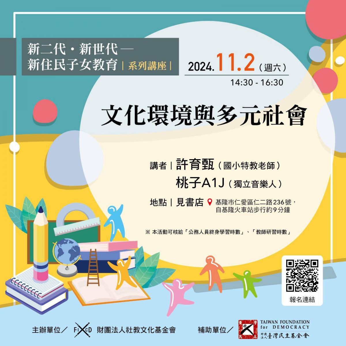 |活動對象:關心新住民、新二代教育文化議題的夥伴,並可核給「教師研習時數」、「公務人員終身學習時數」。