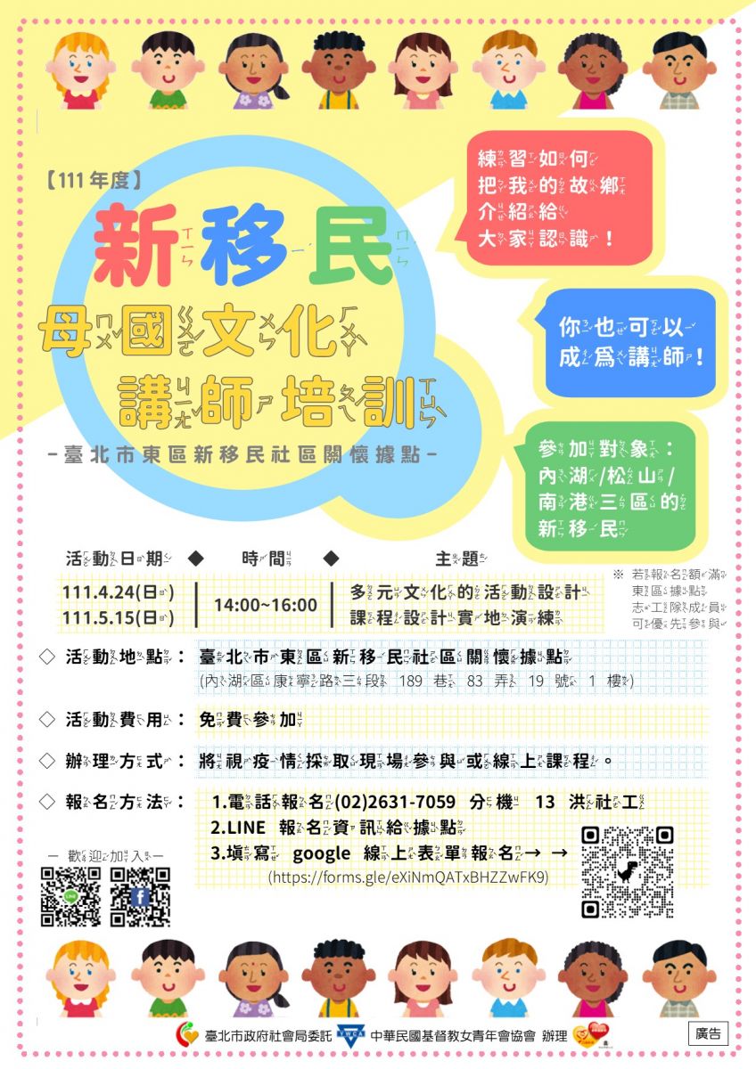 ◇參加對象:內湖/松山/南港三區的新移民(※若報名額滿,東區