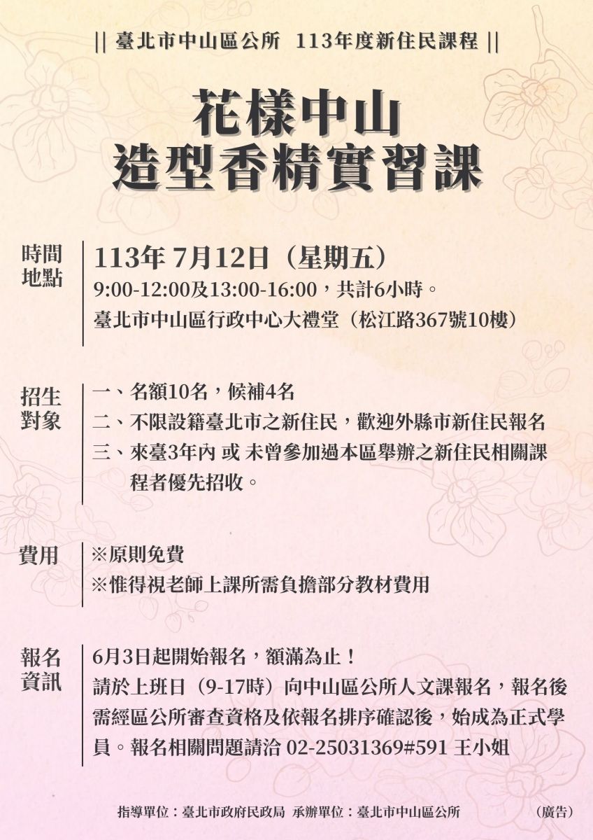 大家好~公所今年新住民課程 「花樣中山 造型香精實習課」於7/12在本所十樓大禮堂辦理 課程將於6/3起上午9:00開放報名!! 歡迎大家至公所填寫紙本報名表,或透過電話及網站(