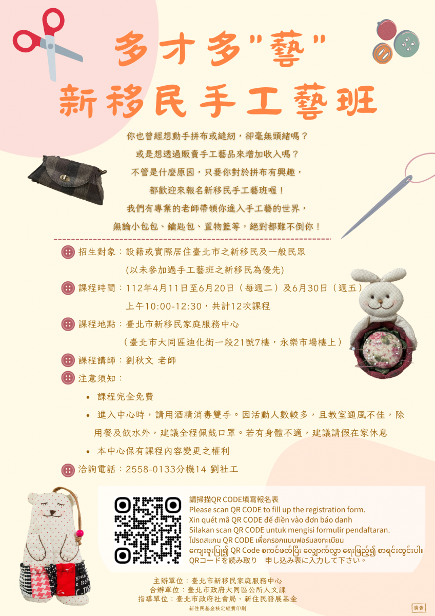 *招生對象:設籍或實際居住臺北市之新移民及一般民眾(以未參加過手工藝班之新移民為優先)