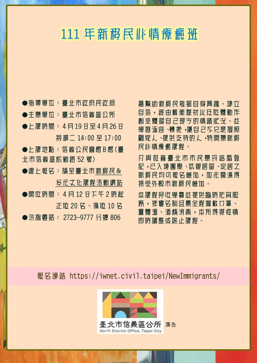 【轉知】臺北市信義區公所-新移民心情療癒班