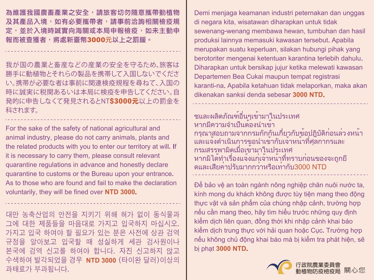 入境時勿攜帶動物檢疫物!倘自過去3年發生非洲豬瘟國家地區違規攜帶豬肉產品入境遭查獲,第1次違規者依動物傳染病防治條例第45條之1及本局「違反動物傳染病防治條例第三十四條第二項規定案件裁罰基準」規定,裁處新臺幣20萬元罰鍰,第2次違規者即裁處新臺幣100萬元罰鍰!