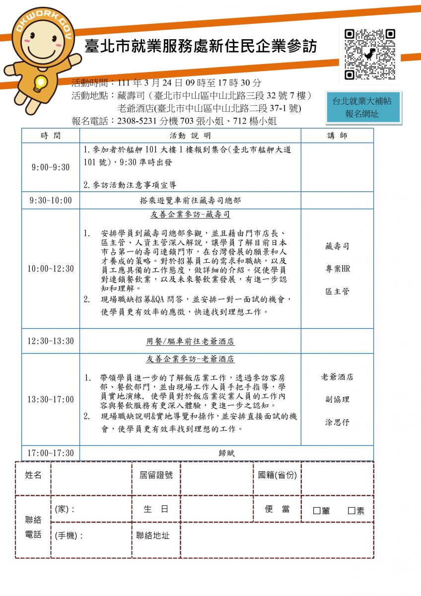 【活動轉知】臺北市就業服務處 新住民 企業參訪
