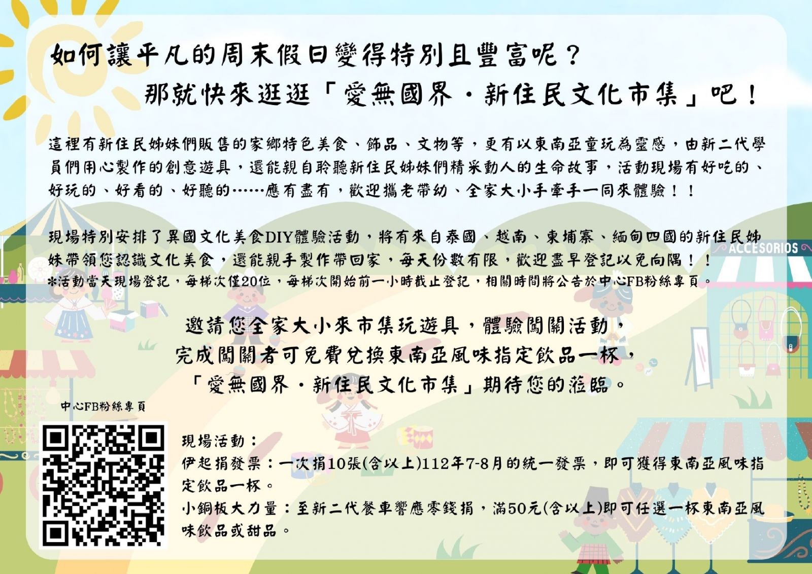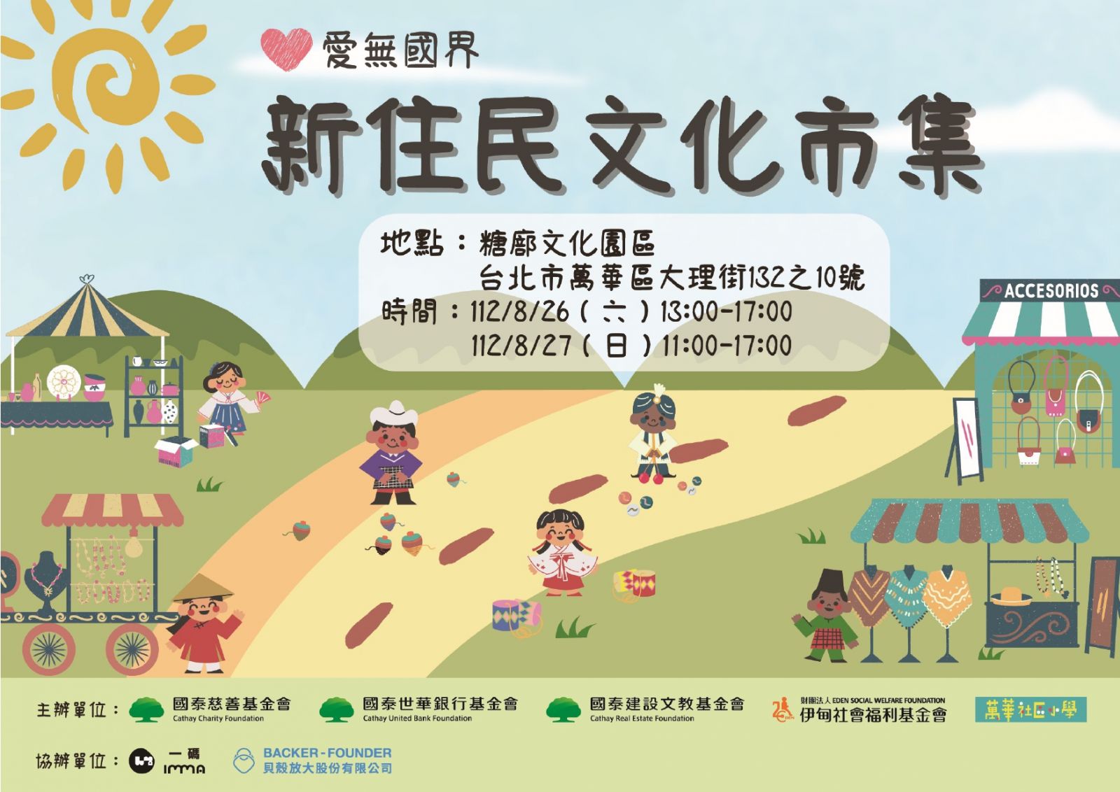 於112年8月26日(六)下午1點至5點及8月27日(日)早上11點至下午5點,於糖廍文化園區C倉與北側廣場(台北市萬華區大理街132之7號)舉辦「愛無國界.新住民文化市集」活動,歡迎攜老帶幼,全家大小一同來體驗~