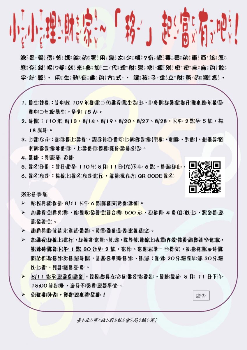 新二代理財課程上課方式有更動,改為線上課程,上課時間為8/13、8/14、8/19、8/20、8/27、8/28,下午2:00至下午5:00,歡迎來報名喔~